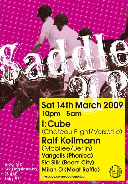 Saddle Up is a bi-monthly deep house / disco / techno party at East London's small, sweaty Bar 512 (located at 512 Kingsland Road, E8 4AE). Be our friend to guarantee entry and get in cheaper.